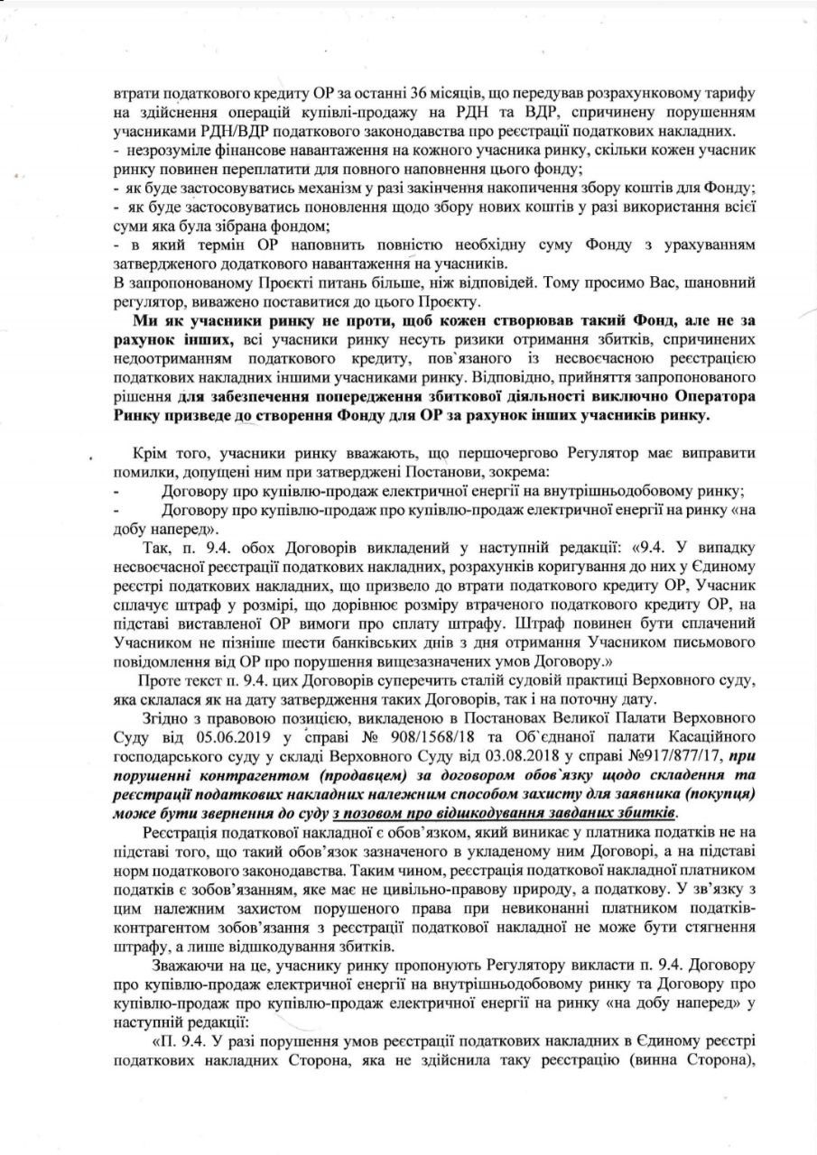 Ми як учасники ринку не проти, щоб кожен створював такий Фонд, але не за рахунок інших, всі учасники ринку несуть ризики отримання збитків, спричинених недоотриманням податкового кредиту, пов`язаного із несвоєчасною реєстрацією податкових накладних іншими учасниками ринку. Відповідно, прийняття запропонованого рішення для забезпечення попередження збиткової діяльності виключно Оператора Ринку призведе до створення Фонду для ОР за рахунок інших учасників ринку.