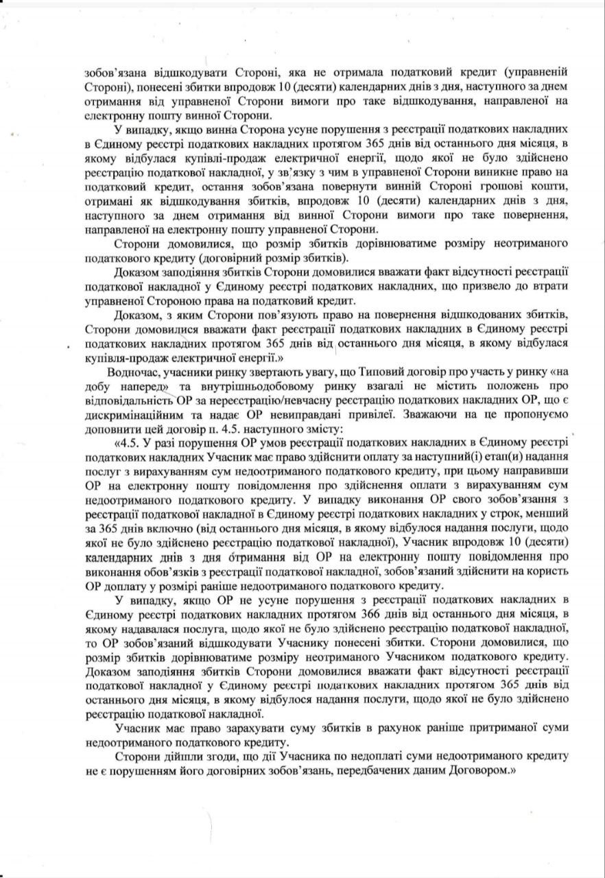 Водночас, учасники ринку звертають увагу, що Типовий договір про участь у ринку «на добу наперед» та внутрішньодобовому ринку взагалі не містить положень про відповідальність ОР за нереєстрацію/невчасну реєстрацію податкових накладних ОР, що є дискримінаційним та надає ОР невиправдані привілеї. Зважаючи на це пропонуємо доповнити цей договір п. 4.5. наступного змісту: